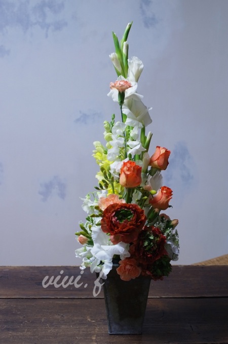 こちらも「ヴァーティカルアレンジメント」。 すっきりとしたイエローオレンジ系の花材で 教室作品です。 北九州 アレンジメント教室 北九州市 プリザーブドフラワー教室 北九州市八幡西区 フラワーアレンジメントレッスン 北九州市八幡西区 プリザーブドフラワーレッスン