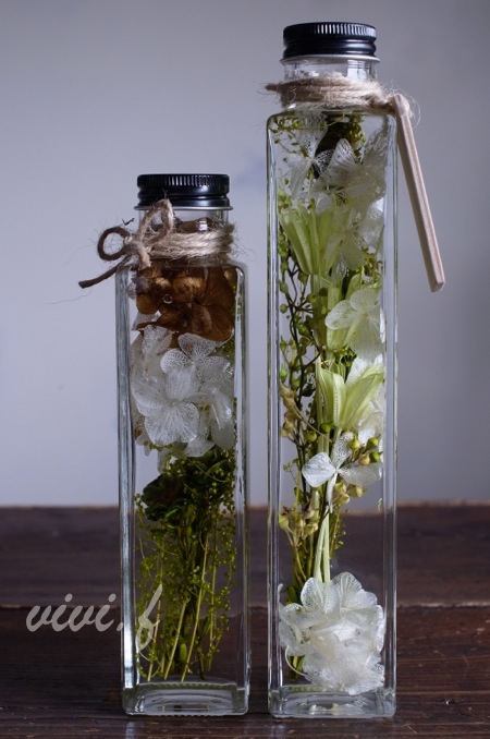 ガラス瓶の中の小さな世界...。引き込まれます 花材の色合わせやレイアウトも様々。 フリースタイルコースの方々の作品です 北九州 アレンジメント教室 北九州市 プリザーブドフラワー教室 北九州市八幡西区 フラワーアレンジメントレッスン 北九州市八幡西区 プリザーブドフラワーレッスン