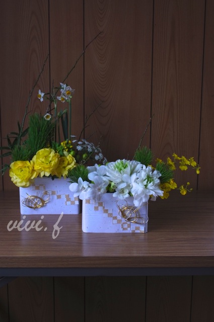 引き続き「2016 生花のお正月アレンジメント」の 教室作品のアップです。 花のアレンジメントについても、もちろんですが、 花器のお化粧や配置の個性にもご注目ください Tさんは、全く違う雰囲気を持つ2作品を作製しました 北九州 アレンジメント教室 北九州 プリザーブドフラワー教室 北九州市八幡西区 フラワーアレンジメントレッスン 北九州市八幡西区 プリザーブドフラワーレッスン