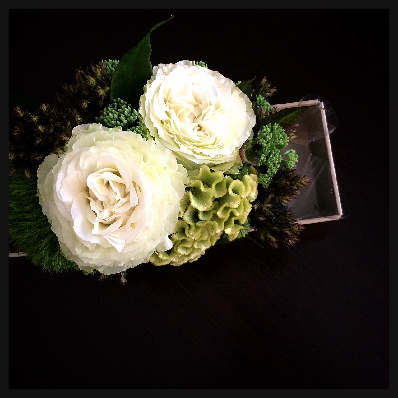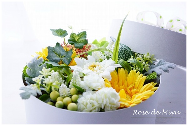 JUGEMテーマ:お花のある暮らし JUGEMテーマ:フラワーギフト JUGEMテーマ:フラワースクール Rose de Miyuが贈るお花のある暮らし アーティフィシャルフラワーを使って BOXアレンジのオーダーをいただきました。 お色はグリーン・ホワイト・イエローでとのご依頼! お色はお任せで!という方もいらっしゃいますが 贈られる方のお好きな色 雰囲気などお聞きさせていただき また、お祝いの内容によりお花選びも考えて 作成させていただいております。 箱を開ける...