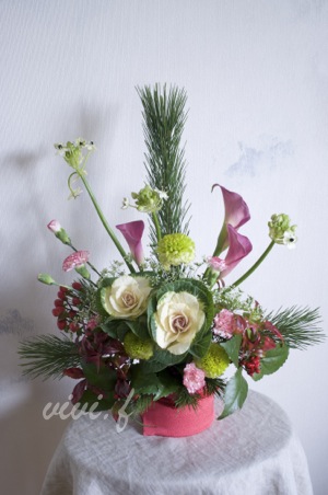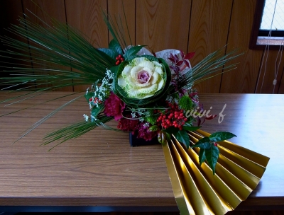 引き続き、昨年末に教室で作製された お正月のアレンジメントです。 大振りな扇子と大きな葉牡丹を使った アレンジメントです(*^--^*/ vivi.f リース...http://vivi-f.com/index.htm