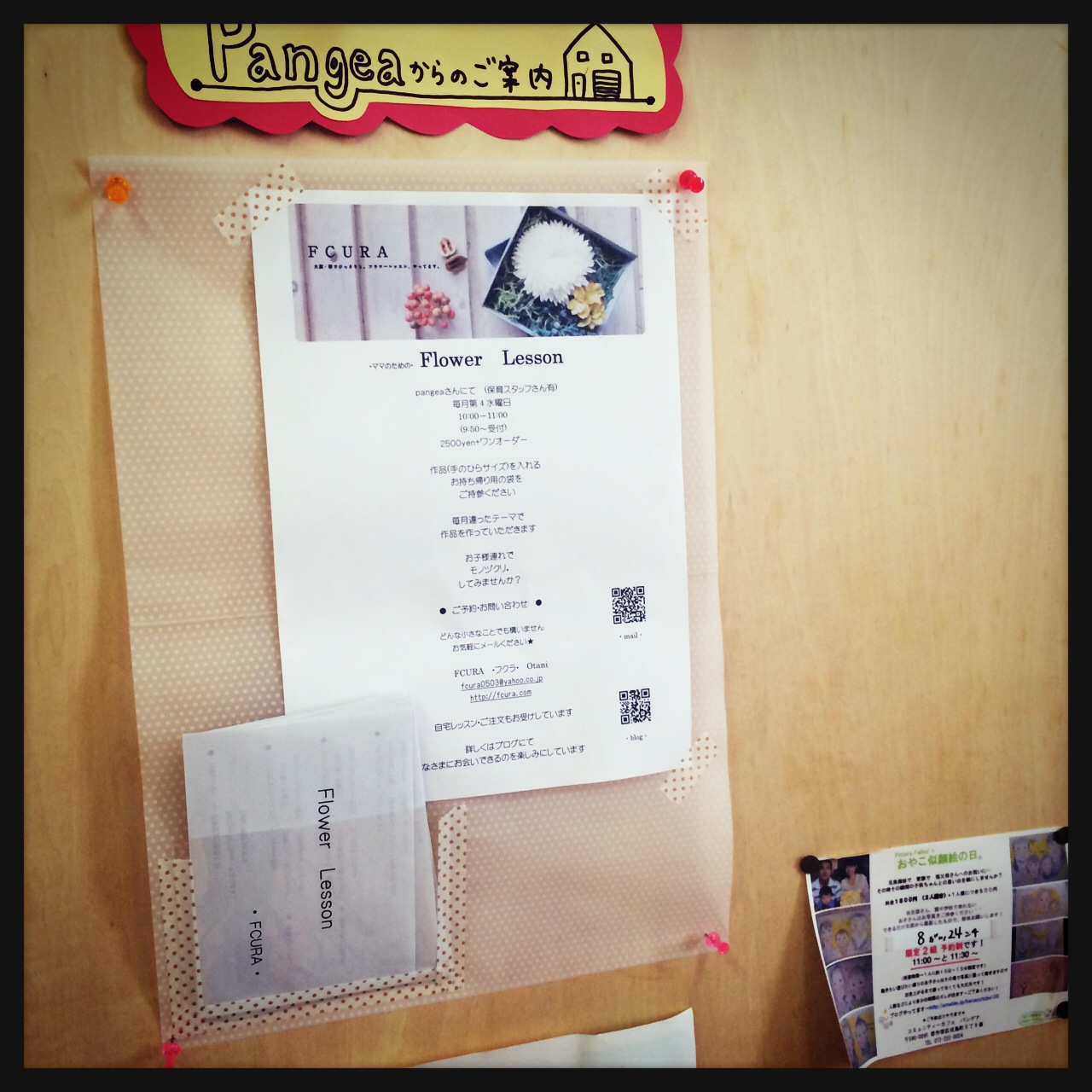 JUGEMテーマ:フラワースクール 堺東駅より5分でフラワーレッスン。 FCURA(フクラ)です^^いよいよpangeaさんでの告知始まりました♪(やっとこさモロモロ作り終えました^^;)pangeaさんのHPはコチラ ↑click↑ ポスターとフライヤーこんな感じで貼ってくれています〜ちなみに右下にちらっとうつっているのは私も書いてもらったあったかーい幸せな絵描きPittore Feliceさんのおやこ似顔絵のポスターです^^pangeaさんでも似顔絵されてますよー★詳しくはコチラ ↑click↑ この日はママ友さんたち...