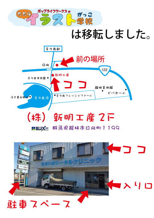以前から少しお伝えしてましたが、群馬県館林市のイラスト教室「たたらイラストがっこ」が正式に移転します。本日の教室で今までの場所は最後でした。 移転日は、1/23で、次回の第四土曜日からとなります。123で覚えやすい! 移転場所は、すぐ近くの多々良保育園前の新明工産2Fとなります。同じ多々良なので、名前は変わりません。たたらイラストがっこのままです。 教室は、多少、狭くなりますが、場所は道路沿いで来やすくなるのではないかと思いますので、よかったら是非! お申し込みや詳細はこちらで また出張教室として...