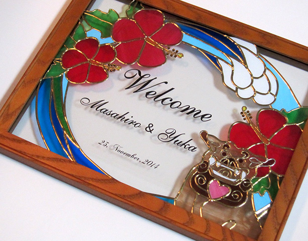 JUGEMテーマ:私たちだけのオリジナルウェディング JUGEMテーマ:たのしい体験教室 沖縄で結婚式を挙げられるということで、ハイビスカスとシーサーをテーマにした作品です。 シーサーはリアルにすると怖くなり、甘くすると漫画チックになってしまいます。 怖すぎずかわいすぎず・・・。 デザインをどうまとめるかも難しいところですが、細かい作業が要求されるこのデザインを如何に仕上げるかもポイントです。 3?リードと2?リード、3?リードを2本に裂いてなど、作業性を考えながらリードそのものにも変化をつけ、丁寧に...