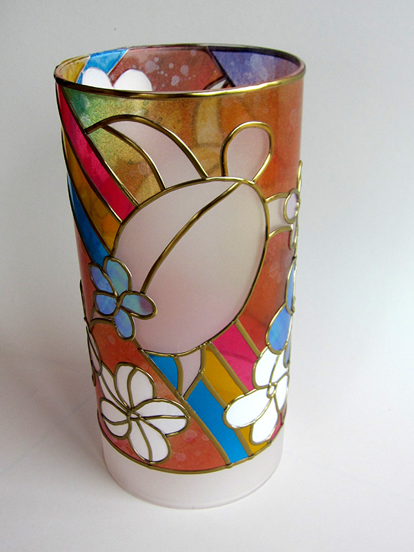 JUGEMテーマ:たのしい体験教室 素敵なハワイアンデザインのランプシェードが出来上がりました。 ハワイアンデザインの代表であるカメ、プルメリア、虹がちりばめられたかわいいデザインです。 ガラスのマット地をそのまま利用することで「白いカメ」を表現し、プルメリアの「白」と表情を変えています。 光はご自宅に帰ってから灯されます。 そこでかわいいランプが完成します。
