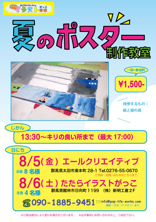 8月のイラスト教室日程は以下の通りとなります。今月はポスター教室がありますので、お気軽にご参加ください。 ・群馬県館林市「たたらイラストがっこ」初回の方は要予約 開催日:8/10、24(水曜日17:30〜) 8/13、27(土曜日14:00〜、15:30〜) ・群馬県太田市「エールクリエイティブ」で出張イラスト教室を行っています。 確実に参加したい方はお店にご確認を。 開催日:8/8、22(月曜日17:30〜) ・8/5(金)夏のポスター教室/太田市エールクリエイティブ/13:30〜17:00/定員8名...