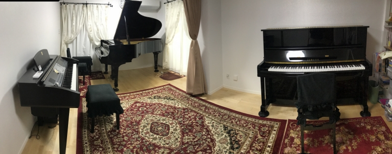 ★★★ ピアノが増えました💕 ★★★ アプライトピアノを預かることになりました。 全部で5台のピアノになります。 待ち時間の練習。皆で即興。ドリルの確認。 とても便利になりました。 発表会では、2台ピアノの練習にも活躍しました。 パノラマで撮らないと、写真におさまらないです。 この写真は、ピアノを入れるために片づけたお部屋。 今は教材であふれてます💦 JUG...