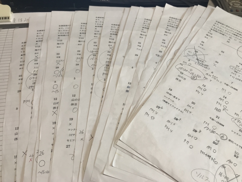 ら★★★ 夏休み中のスケジュール ★★★ 一人ずつの予定を照合! 夏休みの間も、お休みしないでレッスン出来るように。 前後にお友達と並んでレッスン枠を取り、 少しの時間でも、グループレッスンできるように。 私が調整考えて、レッスンスケジュールを組みました! 机に向かう2日間、疲れた💦💦 けれど、休む子はいないように💕 都合に合わせてあげられるように😊d...