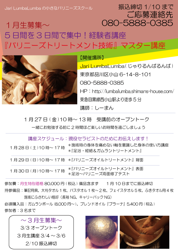 JUGEMテーマ:習い事・資格・講座 こんにちわ、 Jari LumbaLumba しーまんです。 1月生募集!! 短期集中 5日間を3日間でバリニーズ技術を取得する マスター講座! サロン&スクールサイト http://lumbalumba.shimans-house.com/ サロン&スクールFBページ https://www.facebook.com/balinesearomaLumbaLumba/ いいね!お願いたします<m(__)m> *****サロン&スクールの開催場所**** 東急目黒線 ...