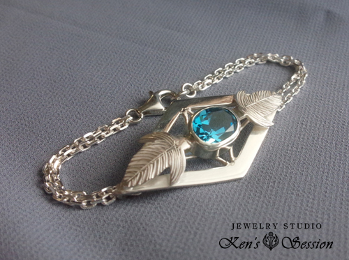 JUGEMテーマ:習い事・資格・講座 おはようございます。 天気にも恵まれたシルバーウィーク、皆様いかがお過ごしでしょうか。 体験レッスン、通常のレッスンともに、大変ご好評いただいているジェエリー教室ですが、先日のレッスンで生徒さんの素敵な作品が仕上がったのでご紹介します。 素材はシルバー925、センターにはブルートパーズがセットされています。 この作品の拘っている所は、まず菱形という一見堅いイメージのベースの上に、植物の葉が置かれた対照的な面白さ。 ファセットカットされたブルートパーズ...