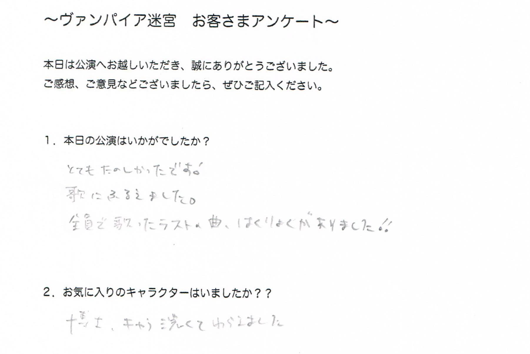 前回も書きましたが、今回のミュージカル公演でプログラムと一緒にお渡ししたアンケート、回収率が80パーセントくらい(目測)ととても高く驚きました。内容もみなさんたくさん書いてくださり、一同でうれしく、面白く読ませていただきました。 来てくださったお客様方、本当にありがとうございました 一部ご紹介・・ さて、こちらのアンケートには、ご感想と、2つめに、お気に入りのキャラクターは??という人気投票を入れてみました。 というわけで、 人気投票、 結...