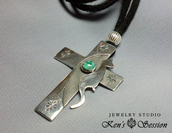 JUGEMテーマ:習い事・資格・講座 好評いただいております、ジュエリー工房ケンズセッション彫金教室。 生徒さんの素敵な作品が仕上がったのでご紹介します。 素材はシルバー925、石はターコイズ、前回の作品がチェーンネックレスでしたので今回は鹿の革紐をチョイスされました。 大きく取ったベースとの段差部分が黒仕上げでいっそう際立ちます。 ラウンドカットターコイズの6ミリを綺麗に石留めされ、横に配置された猫のシルエットは石に寄り添うように佇む愛らしい雰囲気が出ていますね。 写真では伝わりづ...