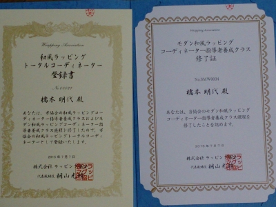 JUGEMテーマ:習い事・資格・講座 モダン和風ラッピング指導者クラス2日目 修了書のほかに、私は和風ラッピングの指導者も持っているので 和風ラッピングトータルコーディネーターも頂きました。 勉強した内容を皆さんにお伝えできるよう さらに精進して頑張ろうと思っております。
