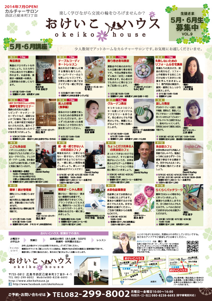 JUGEMテーマ:習い事・資格・講座 お待たせしました!! おけいこハウス講座案内*5月6月最新号です! <表面> <裏面> 新しい講座も登場! 人気講座は定員になり次第締め切りとなります。 お早めにお申し込みくださいね。 お申込みお問い合わせは おけいこハウスホームページ http://www.okeikohouse.jp または お電話 0822998002 でどうぞ。 たくさんの笑顔が集まるアットホームな教室です! 皆さんのご参加をお待ちしています♡ おけいこハウス
