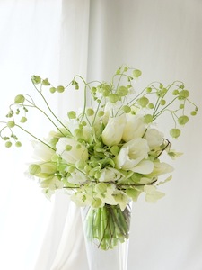 昨日、今日とお天気で、お陰さまで雪もどんどん溶けています。 しかし、各地で雪の影響がいまだ解消されないようですね。宅配便も混乱。 昨日までの天気予報では、明日、明後日と雪マークが出ていましたが、それが消えて一安心といったところです。 今週末は、また婚礼の仕事もあり、もう何も起こらないで欲しいと願うばかりです。 さて、本日は、花問屋アソシエさんで、うきうき花レシピの撮影でした。 こちらは、本日製作のお気に入り、白チューリップのブーケ。 春のウエディングならば、チューリップは是非使いたい花材で...