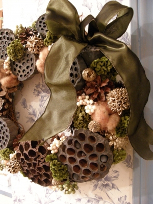 JUGEMテーマ:フラワーデザイン 茨木の鳩子が、れんこんを作っていて、リースにとたくさんハスの実を送ってくれました。こんなに大きいハスの実・・・どうしよ〜ザ・ハスの実って感じのリースになりました今年最後のレッスンお正月飾りにもハスの実を使いました松と牡丹と苔にハスの実破魔弓も加えて・・・それぞれ同じ材料ですが、違いますねみなさん素敵ですお疲れ様でした来年もよろしくお願いいたしますよいお年を・・・。