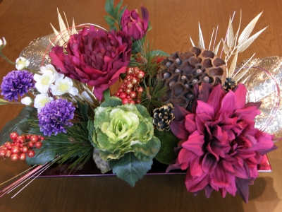 JUGEMテーマ:フラワーデザイン 今シーズンのお正月飾りはゴージャスドライのハスの実とアートフラワーでみなさんそれぞれ、素敵に出来上がりました。コケ玉、葉ボタンがかわいいお疲れ様でした。来週はお正月お飾りです
