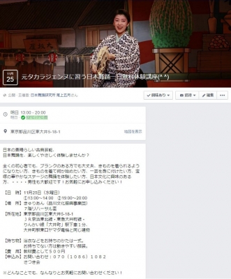 JUGEMテーマ:日本舞踊 「元タカラジェンヌに習う日本舞踊一日無料体験講座」 第一回、いよいよ明日開催です。会場はこちら。 出来るだけ沢山の方に楽しい日舞の世界を知って頂きたい、、、 まだまだ受け付けておりますので、Facebookページ又は 以下のお問合せページからもどしどしご応募下さい。 http://onoe-satsuki.com/toiawase/index.html 又、12月9日には第二回も予定しております。 今回、ご都合があわなかった方も次回是非お会いできます事、 心よりお待ち申しあげておりますm(_ _)m