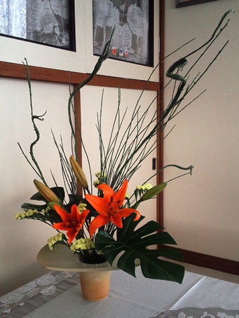 3連休の最終日、今日はお稽古に行ってきました。 今日の花材は、セッカエニシダ、ユリ、モンステラ、スターチスです。 先生いわく、「もうちょっと動きのある、斬新な作品になっても良かったかしら…」と。 スミマセン… つい、枝ものはまっすぐ使おうとするクセがあります。。。 ま、これはこれで。