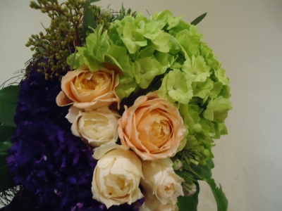 JUGEMテーマ:お花 飛行機雲がたくさん空に出てたので 雨になりそうですね 寒さは緩んで暖かい日が続きましたが これからは一雨ごとに寒くなり 本格的な冬到来です 冬があるから春が嬉しいですね 生花のレッスン アプリコットオレンジの薔薇 フリルの入った紫のトルコキキョウ グリーンアジサイ ユーカリ リューカデンドロン レモンリーフ