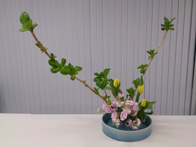 <花材> コデマリ・スカシユリ・ストック <課題> 自由作品 <設置> (忘れた・・・) 先週まで基本花型集中月間・・・と言っていたのに、今回は自由作品。・・・というのも、今日で先生が引退されることになり、今の華道部としての活動は一旦終了となりました。なので、最後は自分らしく好きなように!と。 本当の意味で「自分らしい」のは、自他ともに認める素っ頓狂な作品(笑)なのですが、花材の関係もあり、本人比で大人しめに纏まってしまったかな〜? とりあえずコデマリの枝の流れを生かすのを意識した...