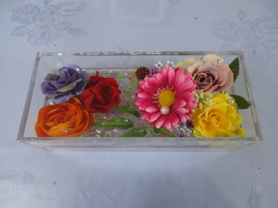 JUGEMテーマ:お花 爽やかな春風がしあわせをたくさん運んでくれます 寒い冬の後は必ず春がやってきますね ジェルフラワーレッスン ティシュケースジェルとメガネ入れジェル 作られたお母さんと一緒に娘さんも作られました 前回はティシュケースジェル作られ 今回は蓋付メガネ入れジェルと 先輩のプレゼントにメガネ入れジェルを作られました 蓋の部分 メガネ入れる器、底にもジェルフラワー 蓋をのせて出来上がり たくさん作ってサングラスやアクセサリー等入れて お部屋に並べると可愛いです アクリル...
