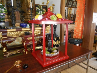 JUGEMテーマ:お花 本日はなまつりでした。 お釈迦様の誕生日をお祝い。 今年はシェチカさんに相談して花御堂をアレンジ。 寺庭が飾り付けにトライ(#^.^#) 30名弱で和讃供養。 甘茶をかけて供養します。ちびっこも一緒に。 斎座のようす。お参り様☆ 本日のお飲み物は甘茶と白酒。 完飲ですヨ〜!