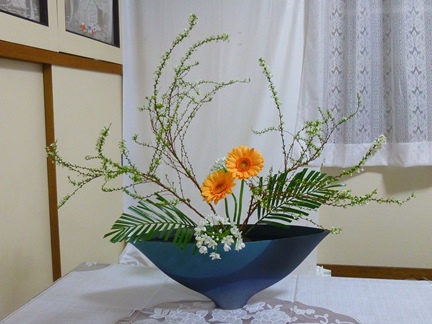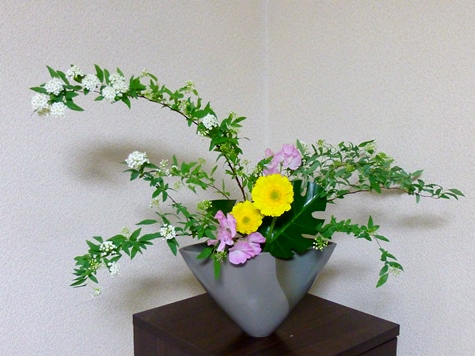 今日のお稽古は、コデマリと…なんとも春らしいお色です。 ピンクのスイートピーと、黄色のガーベラ、青々したモンステラでした。