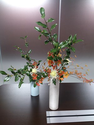 <花材> 山茶花・ドウダンツツジ・菊 <課題> 草月カリキュラム 2-19 第八応用併合花型[投入+投入] <設置> 不明 2つ合わせて一つの作品になり、かつそれぞれが独立した作品になる・・・という課題。 同じ花材を使って繋がりをもたせつつ、手前(白い花器)はドウダンツツジの紅葉を見せ、後方(青磁色の花器)は山茶花の緑の葉を強めに見せるように挿しこみました。 JUGEMテーマ:お花