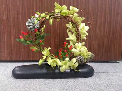 <花材> 小豆柳・デンファレ・ヒペリカム<課題> 草月カリキュラム 4-19 場面を想定して ・・・クリスマス<設置> 受付この時期はやっぱりクリスマスっぽい作品にしたい!ということで、ひねりもなく(笑)リース風。小豆柳でベースを作って、リースの飾りに見立ててデンファレとヒペリカムを挿しこみ、松笠やピックを飾りました♪JUGEMテーマ:お花