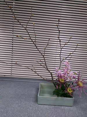 <花材> 土佐ミズキ・菊・SPストック <課題> 草月カリキュラム 1-7 基本傾真型[盛花] <設置> 受付 (床に置いて撮ったので、写真が曲がってしまった・・・汗) 2014年初稽古! 毎年最初のお稽古は初心に帰るべく、なるべく基本花型を履修するように心がけています。今回は土佐ミズキの繊細な線を生かそうと傾真型にしてみました。 そして今日の一押しは菊!糸菊の一種らしいのですが、花火のような咲き方で面白い♪ JUGEMテーマ:お花