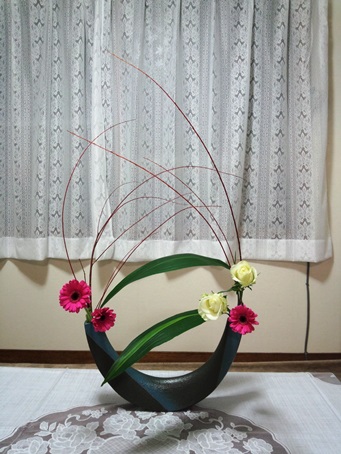 更新の間隔があいてしまいました。。。さて、今日は生け花のお稽古でした。レッドウィロー、白バラ、ピンクのガーベラに、ハランの自由花です。きれいなピンク色。春の色♪