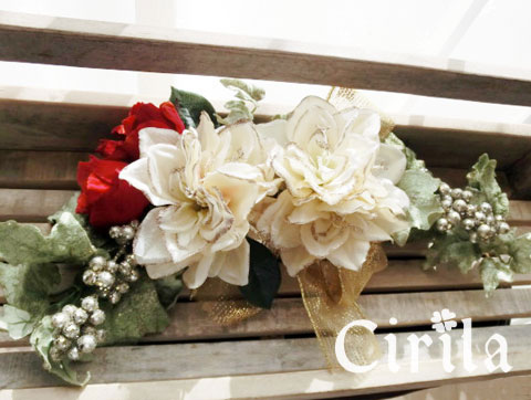 JUGEMテーマ:お花 きらきらのスワッグを作りました。 白くてきらきらしていて上品なお花はアマリリスです。 アマリリスの花弁の周りがきらきら、アイビーの葉っぱもきらきら、 グレープはなお、きらきらしています。 写真ではわかりにくいかな・・・ アマリリスは昔はあまり好きではなかったのですが 最近とても上品で大人な花だと気づき使ってみたい花材になりました。 赤いバラもアイビーもベルベットのようでとても高級感があります...