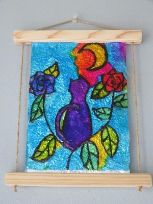 JUGEMテーマ:パン教室 ちょっと前の話ですが、本当に久しぶりに、娘と岡崎のこども美術博物館に行きました。 展覧会も面白かったですが(紙の作品展)、何か作品が作りたかったようなので、造形教室へ。 1度作ったことがあるのですが、ステンドグラス風な飾りをチョイス。 これ、「乾くのを待つ」という時間があるので、作業時間が長くなるのですが、まぁ、久しぶりだしね。じっくり、作ってもらいました。 『猫と薔薇』とでも言うのかしら。 下絵は、...