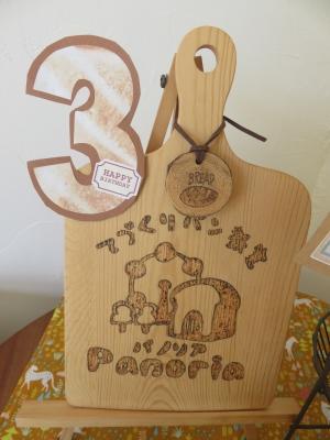 JUGEMテーマ:パン教室 9月が、お誕生日月ということで、3歳になるパノリアちゃんですが、さりげなく(露骨に?)、『3』を飾っています。 どどんと『3』 これは、レトロなイラスト。3歳の男の子をお祝いするようなメッセージが書かれています。 リボンは、娘が作ってくれたものを、貼り付けました。 そうそう、先日の娘の山の学習ですが、やっぱり、雨がひどくて、室内でのゲーム大会で、盛り上がったそうです。 ...