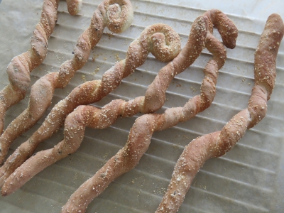 JUGEMテーマ:パン教室 暑い!!暑くなってきました!! 週末は、またお天気が崩れるようですが、梅雨明けもそろそろですかね・・。 うちの2人は、昨日から半日授業になり、ここから夏休み終了まで、再び、お昼ご飯を作らねばならない日々が続きます。 給食のある地域が、うらやましい・・。 さて、夏ミニレッスンを行っている最中ですが、グリッシーニを成形していると、何かに見えてくる・・。 白い生地に黒ゴマが入っているので、昨...
