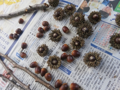JUGEMテーマ:パン教室 今月のテーマは『秋な感じ』 秋とは何か・・って感じですが、木とか落ち葉とかかな。 で、費用削減&リアルさを求め、南公園で、娘と「秋」を拾ってきました。 どんぐりや枝。 お洋服を着たどんぐり。いそぎんちゃくみたいだけど・・・。 で、ダイソーで見つけたお花形のフェルト。 グルーガンで、このフェルトにどんぐりをくっつけます。 園児の工作レベル...