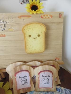 JUGEMテーマ:パン教室 今月は、ハードトーストという名の食パン。 安易に、食パンをところどころに配置。 食パンのスポンジが、浮かんでいるというホラー感・・・。 これを、「可愛い」と思わせようとしている自分が恥ずかしいですが。 私の「しつこさ」がこういう所に出るのよね。 食パン形のコースターに、食パン柄のメモ用紙を貼り付け、さらに、食パンイラストのスタンプを押すという、たたみかけるような、押し売り的な手...