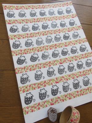 JUGEMテーマ:パン教室 いちごのパン、お持ち帰りの袋にペタっと貼ってもらえるようなものを作ろうと思いまして。 1人8個だし、シールだとコストがかかってしまうので、ここは、一番安い「紙」でいくことにしました。 用意したのは、いちごちゃんスタンプといちご柄のマステ(100均)。 まず、A4の紙に、いちご柄のマステを帯状に貼りまして・・。 次に、ひたすら、いちごと「P」のスタンプを帯状に押したら、こんな風。 ピ...