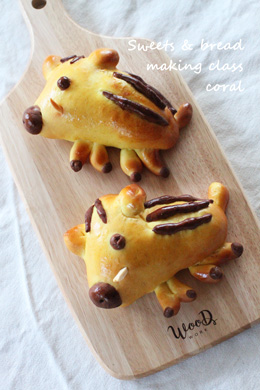 1回完結のレッスンです。 2種類のパンを作り、 試食を兼ねたランチ付きの レッスンになります。 ひき立てのコーヒーとご一緒に 焼きたてのパンをご試食下さい。 メニュー 「走れ!うり坊」 お一人さま2個 試食別 今年の干支のいのしし型のパンです。 カレー風味の生地の中に ハムとクリームチーズが入っています。 「レーズンとくるみのリングパン」 おひとり様1個 レーズンと香ばしいくるみが入った リング型のちぎりパンです。 基本のおさらいにも。 日程 各10時〜13時半ごろ 1/11...