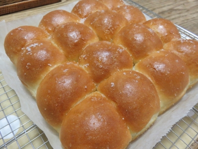 JUGEMテーマ:パン教室 私もですが、子供たちは『塩バターパン』が大好き。 近所の某スーパーの「格安・塩バターパン」は大好物です。 レッスンでも、塩バターパンが好きと言われる方が多いですね。 で、今月レッスンのちぎりパンを塩バター味にアレンジしてみました。 焼き上がったのが、夕方だったので、色気のない写真になっていますが・・・。 レッスンでは、焼成前に粉をふって焼き上げるだけなのですが、これは粉をふらないで...
