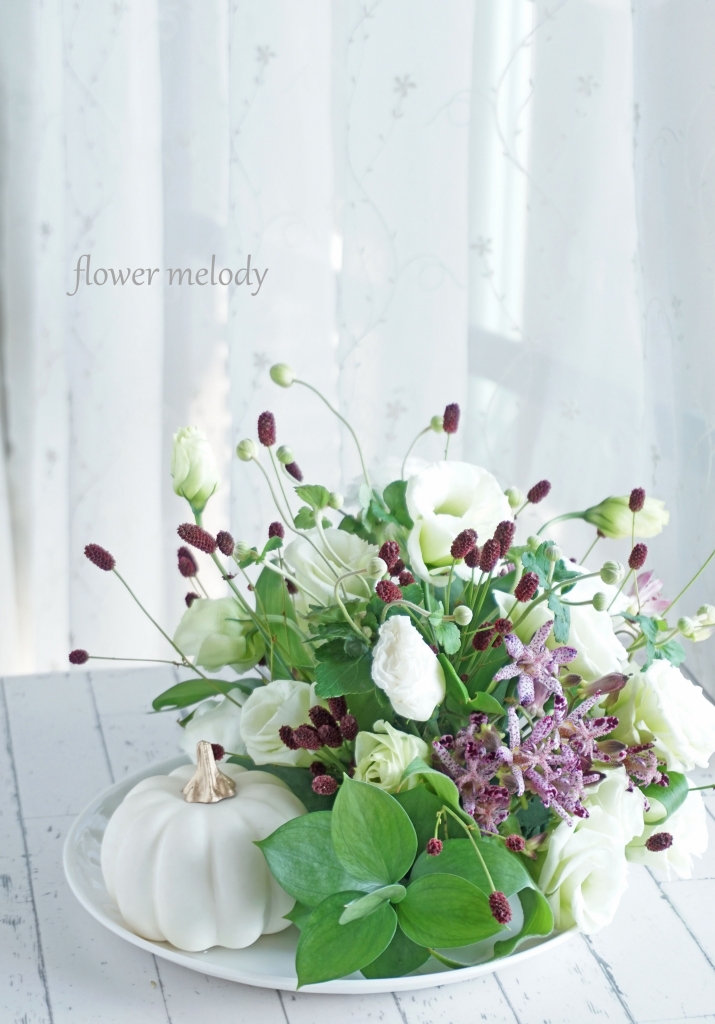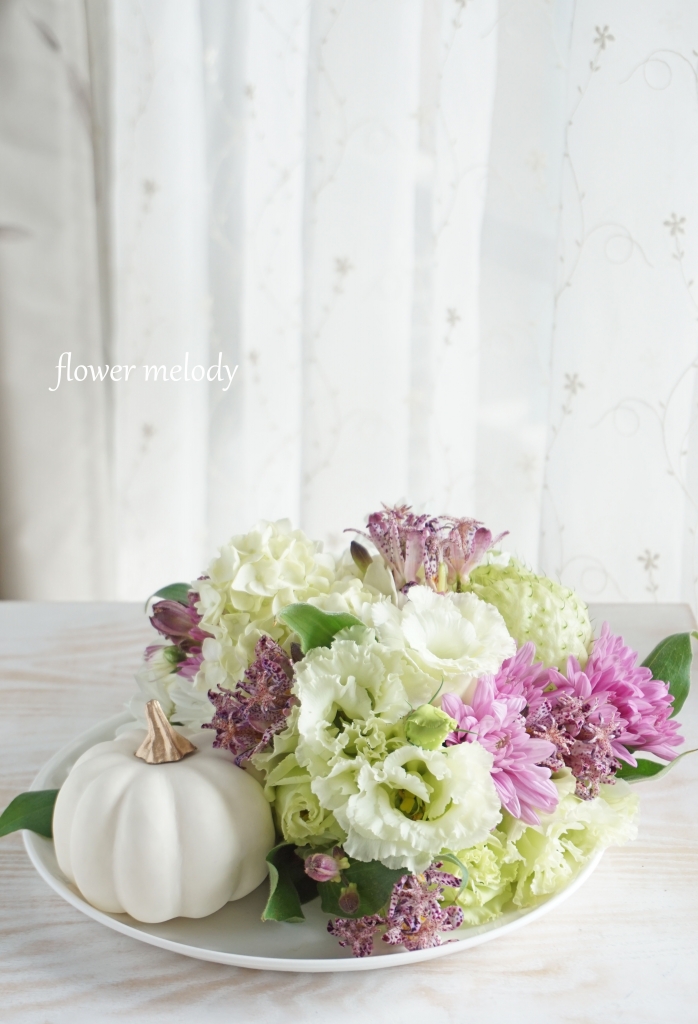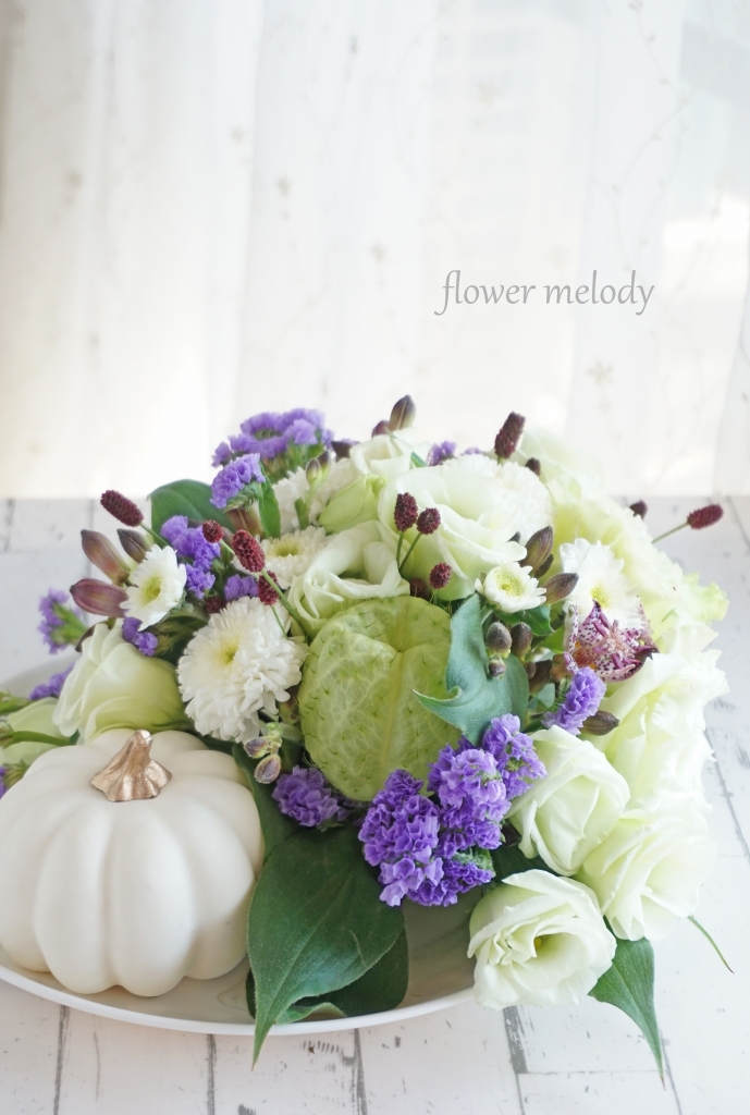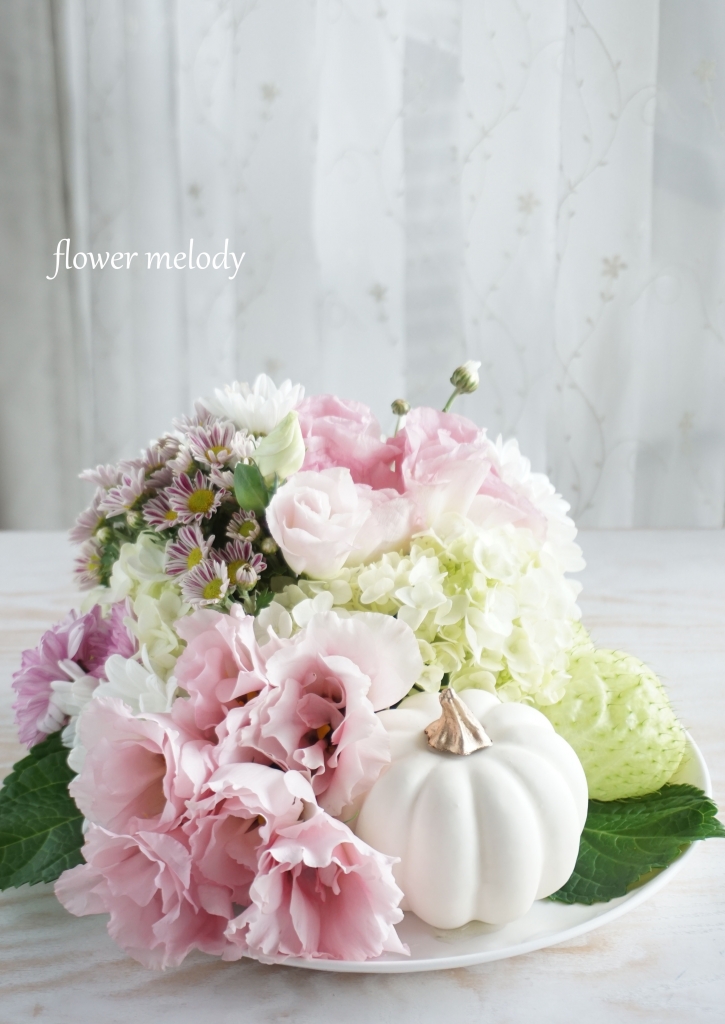 by miyako 日本の歴史的記念日 ❝即位礼正殿の儀❞ である昨日 お休みを利用して、はるばるレッスンにお越しくださいました。 今回のお花は、ホワイト系よりほんのりピンク率が高めです。 トルコキキョウのフリフリを生かされて ピンク好きな生徒さんのイメージぴったりな作品となりました。 こちらは反対側から見たところです。 定番のオレンジパンプキンもいいですが 今年のホワイトパンプキンは、主張...