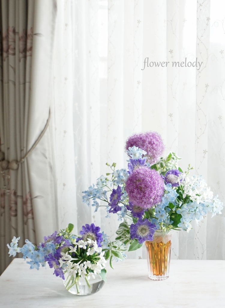 by kazuko 今回も涼しげな作品が完成いたしました。 しかし、ここで最初にひとつ、言い訳をさせてくださいませ〜 右側の花瓶のお水の色は、故意ではなく ギガンジュウム(大きいパープルのお花)の切り口から出る液の色なんです(;^_^ ギガンジュウムは切り口からオレンジ色の液が出るのはわかっていたんですが お水が染まるほどではないと思っていたので・・・ スポンジや剣山、ガラスではない花器に挿すことはあっても ガラス花器に入れることは今ま...