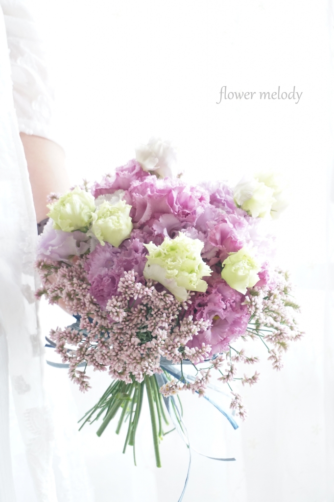 by mitsuko 1年を通して出回っているトルコキキョウですが、実は夏のお花。 そんなトルコキキョウは不思議なことに 1つの枝からそのお花の本来の色の他に 淡いグリーン、ホワイト系のお花も咲いてくれます。 今回は、パープルのトルコキキョウとスターチスのみで プチブーケを作っていただきました。 by noriko 野原から積んできてサクッと束ねたように、さりげなく。 でもちゃ〜んとスパイラル状に組まれています。 ...