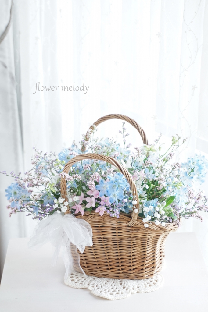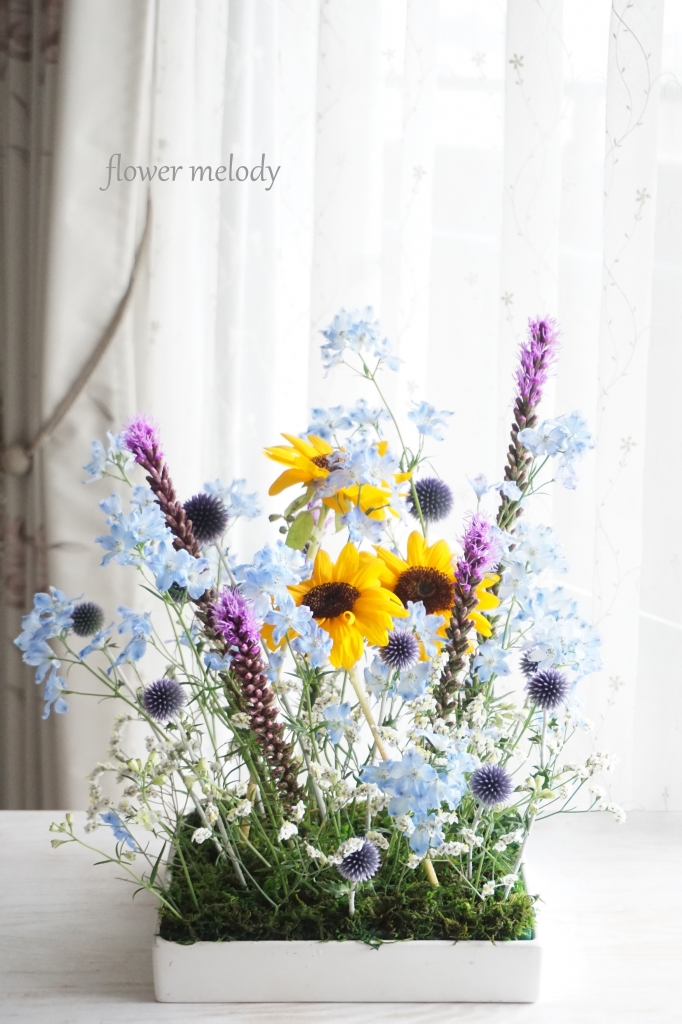 by takako 涼しかったり 暑かったり ムシムシしたり 相変わらず気温の変化が激しい毎日です。 この時期から夏にかけては、やはり視覚的にも涼しげなのが一番。 夏のお花の代表的なヒマワリの黄色に 反対色のブルー系で涼しさをプラスしました。 お花は入れすぎず、空気感を出して風が通るようなイメージで。 とてもバランスよくサクサクと仕上げられました。 今月もお越しいただきましてありがとうございました‼ &nb...