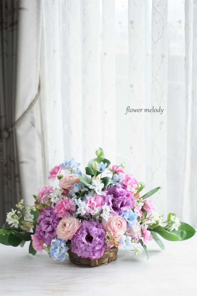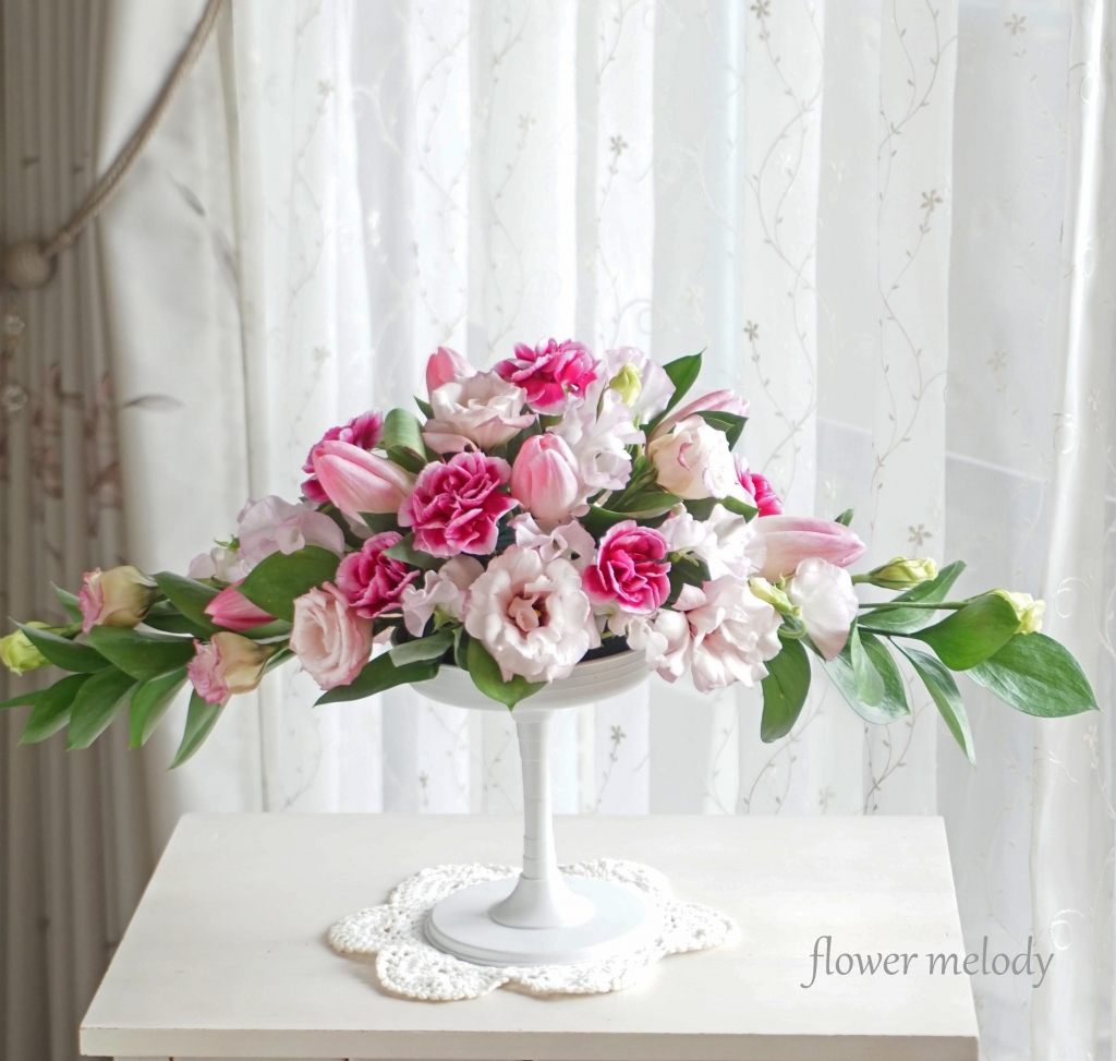 by takako ご紹介遅くなりましてスミマセン・・・ 先週のレッスンご報告です。 基本形のひとつ、ホリゾンタルアレンジ。 この形は裏表の無い360度展開で、どこから見てもお花が綺麗に見えるように制作します。 見本をご覧いただいた時に、皆さん「難しそう〜」とおっしゃるのですが レッスンで制作すれば、必ずちゃんと完成いたします♪ 今回も、綺麗なホリゾンタルが仕上がりました。 ピンク&ホワイトのグラデー...