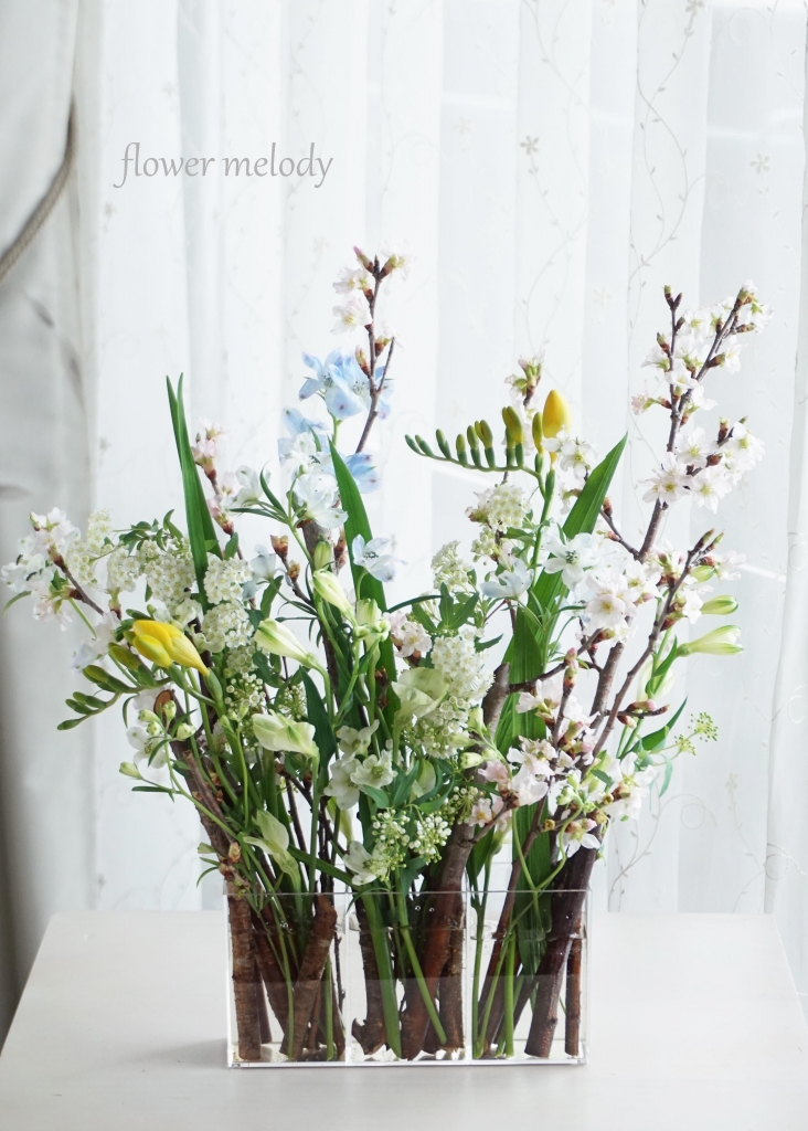 by mitsuko 今月のonedayプチレッスンは 冬の間切り花として出回っている、啓翁桜を使って 主に桜の枝を花留め代わりにしたアレンジ。 by noriko 中に仕切りが付いていて3か所に分かれている器を使用。 実は、セリアの数ある透明ボックスのシリーズなんです。 スリムなボックスですので、びっしりと枝を入れなくてもお花が安定しやすいです。 そして、カウンターやニッチなど、奥行きの無い場所でも置きやすい。 水が見...