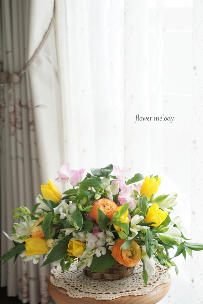 by akiko 3月最終レッスンは、扇型のファンスタイルで 前回記事のレッスン作品のトライアンギュラー等と同じく 180度展開の基本型アレンジ。 黄色いチューリップにグリーン多めでさわやかなアレンジとなりました。 同年代の、生徒さんでもあるお母様に 赤ちゃんを預けてきてくださっている娘さんのレッスン。 もちろん我が子たちと同年代で、お花は1からのスタートでしたが みるみる上達されています♪ 私も嬉しい限りです。 お忙しい中、今...