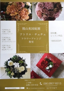 JUGEMテーマ:フラワーアレンジメント 岡山県熊山町の 熊山英国庭園にて アトリエ・tutu フラワーアレンジ教室を 開催します 10月6日(土) バラのアレンジ 11月3日(土) クリスマスアレンジ 12月1日(土) お正月アレンジ 10時から12時 ご予約、お問い合わせ 090−2807−8213 カナヤマまで ...