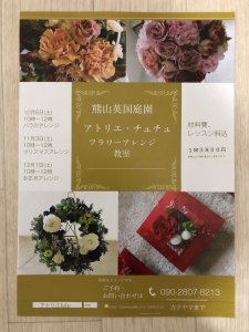 JUGEMテーマ:フラワーアレンジメント 岡山県熊山町の 熊山英国庭園にて アトリエ・tutu フラワーアレンジ教室を開催します 10月6日(土) バラのアレンジ 3800円 11月3日(土) クリスマスアレンジ 12月1日(土) お正月アレンジ 10時から12時 ご予約、お問い合わせ 熊山英国庭園 熊山支所 産業建設課 〒709-0705 岡山県赤磐市松...